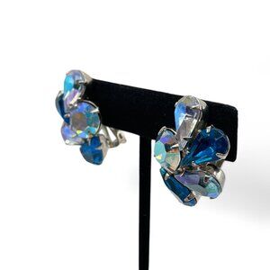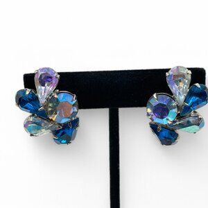 This set of clip-on earrings is a rare find! Each large earring is set in silver tone. A round AB rhinestone is surrounded by 4 teardrop AB stones in varying shades of blue.
