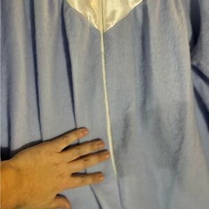 Elegant pajama gown with floral embroidery. Soft blue fabric with cream accents. Perfect for a cozy night in.
