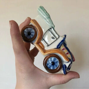 This vintage car decor piece showcases vibrant blue and orange accents, exuding a retro charm. The carefully applied colors create a striking contrast, enhancing its appeal as a unique decorative item. Perfect for adding a splash of color and character to any space.