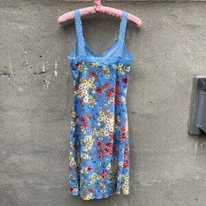 Vintage Blue and Pink Floral Dress with Lace Detailing
