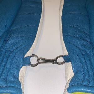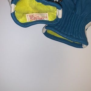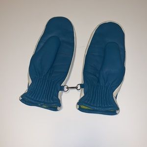 EUC vintage blue and white leather mittens with fluorescent yellow fuzzy lining in women’s size medium (M).