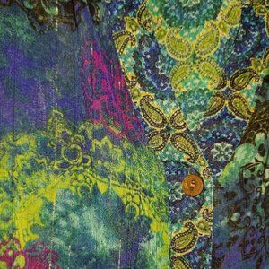 Royal blue with gold pin stripes, lime and magenta highlights. Elbow roll up straps, brassy buttons, empire back, chest enhancing neckline.