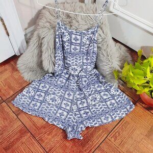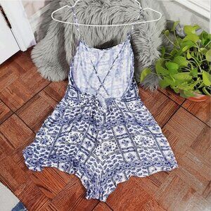 Vintage Size Medium Great Condition Vintage A super cute and luxuriously soft jumpsuit featuring a festival cheeky bottom, a low back design with crossover adjustable straps, and functional side pockets. Square neckline and zipper back opening. The blue and white tone and paisley tiled pattern give this romper a Bohemian vibe. No odours- clean + smoke free home. Hypoallergenic household products only. Delicately washed and hung dried. Brand unknown, no tags Measurements posted above are a close estimate. Use Code MARIBARII for USD$10 / CAD$15 New members only #boho #Bohemian #vintage #retro #lowback #crossover #criss-cross #cheeky #festival #romper #rompershort #jumpsuit #mozaic #tile #paisley #pockets #blue #white #print #vacay #resort #resortwear #summer #summervibes #tiledpattern