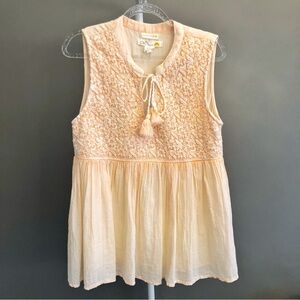 Vintage Boho Floral Festival Beige Casual Sleeveless Top with tassel.