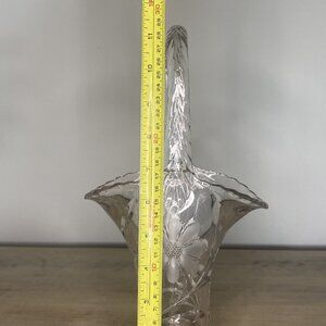 Unique Floral Etched Pressed Glass Handle Basket. Featuring its stunning etched daisy floral design, with scalloped flared rim and braided look applied to handle.