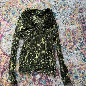 Vintage boho blouse with an allover floral swirl print, ruffled neckline, and flared cuffs. Lightweight semi-sheer mesh with a fitted silhouette. Perfect for boho, fairycore, or Y2K layering looks.
