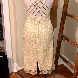 This dress is a buttery/ creamy yellow with gold lace and bright gold straps. Its low cut and the back detailing is so pretty. Falls past the knee. Is fitted but falls nicely over hips. It is a vintage dress so there is some wear from before I purchased it but its in good shape. Great for parties and weddings. Size labelled 5-6. Fits about that small to medium depending on shape. Non smokers, no pets.