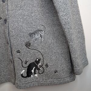 Vintage Bon Worth Woman Large Grandma Cat Embroidered Button Down Cardigan Grey