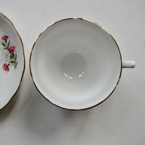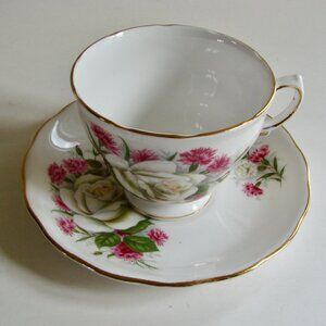 - beautiful teacup and saucer by Royal Vale features white roses with tiny pink flowers, gold gilt trim (not real gold) with scalloped edges