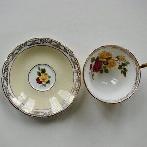 - beautiful teacup and saucer features red and yellow roses with a yellow and white background with gold tone gilt edging with scalloped edges