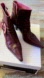 Roberto Vianni short booties in a soft burgundy leather, very pointed toe, pink buckles & strap detail with pink stitching.