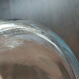The markings are embossed on the glass at the bottom; and the crest logo on the body, opposite the pewter accent.