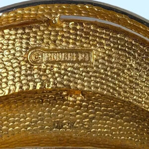 This vintage brooch by Boucher is made of gold and silver tone metals, formed into a curved wedge. At the very tip sits a pearl, which you can see glowing like an angel in the 2nd last picture. The brooch has a modern locking c pin closure and is stamped Boucher (C) on the back. There are some areas of tone loss and/or texture change, but nothing blatant or that affects wearability.