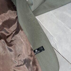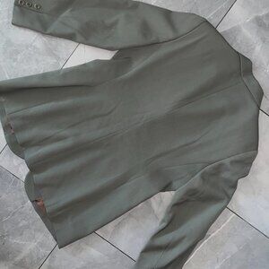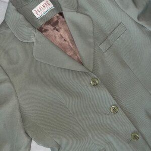Vintage 'Braemar' wool blazer in a sage green, frontal 3 x button closure, side pockets, lined, shoulder pads, button detail at cuffs. No tag indicating size or material.