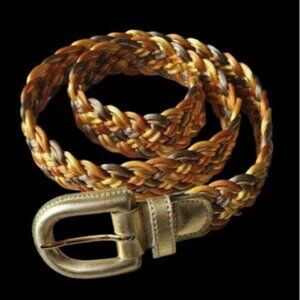 Braided Brown orange yellow nylon fabric with gold tone buckle and gold lace detail.