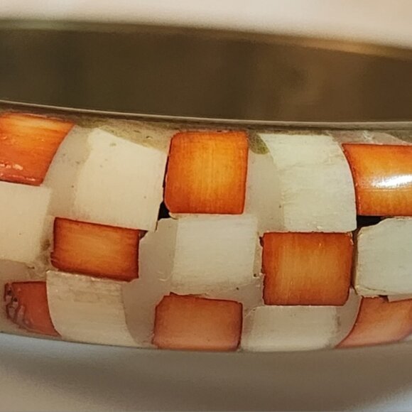 The base of the bangle is brass metal, and the orange and white checkered pattern is often created using inlaid pieces, often natural, bone, shell or other.
