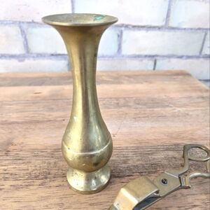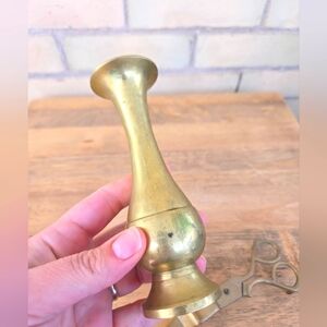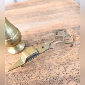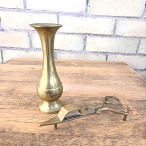 Vintage Brass taper holder and unique MCM brass scissor candle snuffer.