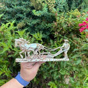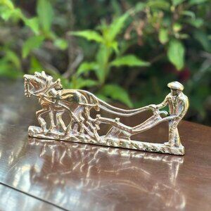 Vintage Brass Farmer and Horse Plow Figurine Rustic Mantel Display Country Farm