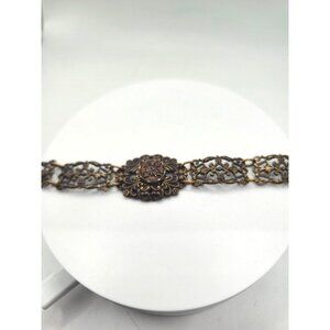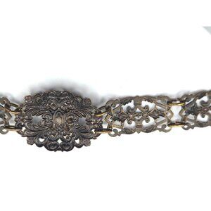 Vintage filigree link bracelet with ornate brass detailing and a raised floral centerpiece medallion. The bracelet features openwork filigree links joined with rings and an embossed floral design at center, giving it an antique Victorian Revival style.