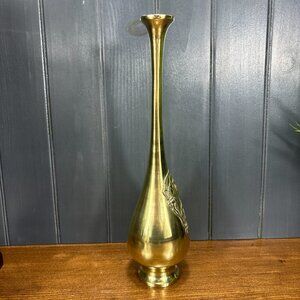 This tall vintage brass bud vase features a slender flared neck and teardrop base with an embossed floral and asian style motif. Likely made in India during the mid-20th century, it reflects the 1960s–1970s fascination with global and Japandi aesthetics.
