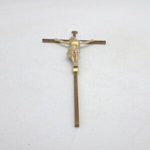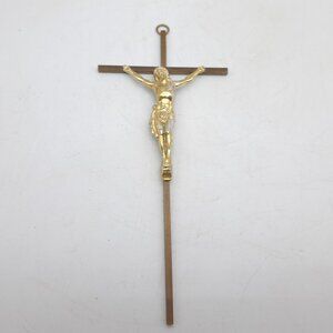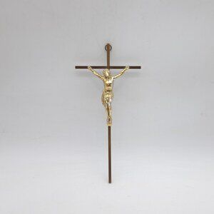 A brass & metal wall crucifix (possibly a coffin crucifix; they are often thin as this one is). The cross is brass while Jesus is made of a non magnetic alloy that has been colored to look like brass. The cross has "Inri" etched in it above Jesus' head.