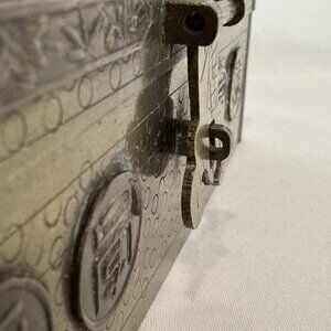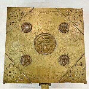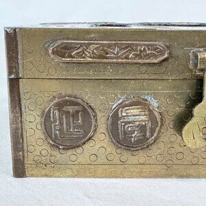 This is a handmade brass box lined in wood. It is heavier. It has lucky coins on the front and top cover. It has its natural patina. It may be from the 1980's. It has a latch so a small lock can be added to help protect whatever is kept inside. It measure 6.25 x 6 x 2.5 inches. Marked made in China on the bottom.