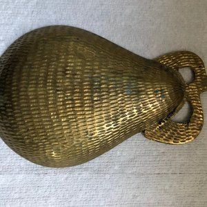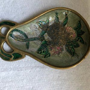 Vintage Brass enameled pear shape trinket dish small plate green, gold and pink