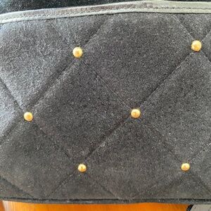 Quilted black suede with front pocket with gold beads, tassel and long strap with buckle to adjust.