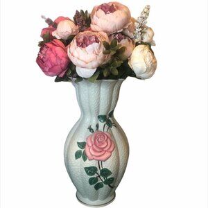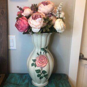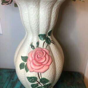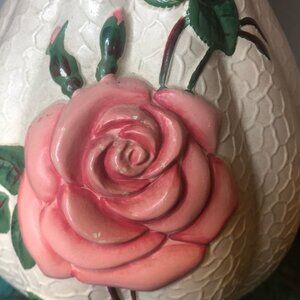 ✨Flowers not included. ✨ This vase was likely created somewhere from the 50's to 60's. Brentleigh goes back to the 20's, the condition would lead one to believe it is the same mould but newer. It is a raised relief floral decorated vase in the which was applied after the pottery had been fired. This method tends to cause some expected flaking over time, which you can see on the flowers. There is also some wear around the rim of the vase which can be covered with the right flowers.