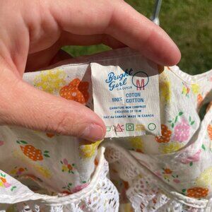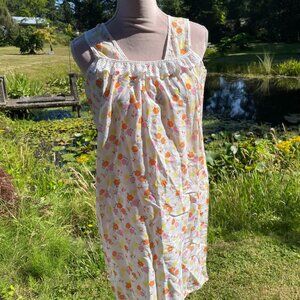 Adorable vintage “Bright Girl” 100% cotton nightgown, made in Canada 🇨🇦. This sweet piece features a cheerful all-over floral print in orange, yellow, and pink, with delicate white eyelet lace trim at the neckline and shoulders. Lightweight and breathable – perfect for summer lounging or as a nostalgic cottagecore addition to your sleepwear collection.