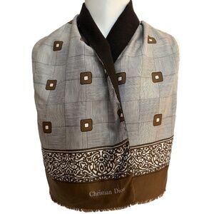 An elegant vintage wool and silk scarf attributed to Christian Dior, featuring the signature printed “Christian Dior” logo on a geometric cream and brown design. The front is a smooth silk twill with a mid-century pattern of fine lines and squares, while the reverse is a soft fine wool in chocolate brown. The luxurious dual-texture construction and timeless pattern are consistent with Dior’s 1970s–80s aesthetic.