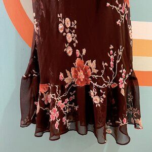 Perfect for a wedding guest dress, a backyard dinner party, or just frolicking about in the summer/early fall! Gorgeous warm brown and floral pattern with beaded embroidery on the front (some beads missing due to age)