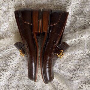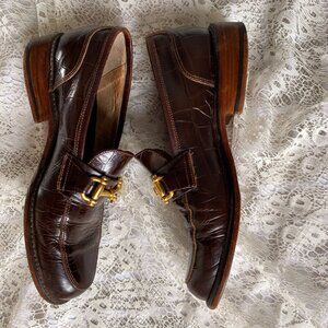 🌿US 7 80s Vintage Heeled Brown Croco Leather Shoes Brass Buckle Gold Finish
