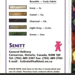 He is made of brown plush. He has black plastic eyes, brown plush nose, and pink tongue and inner ears. The bag is cotton lined in a bright geometric pattern.