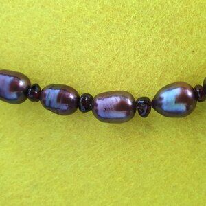 This vintage necklace is made of brownish-purple freshwater baroque pearls and agate beads. It is finished with a solid 925 sterling silver lobster clasp for a secure and elegant touch.