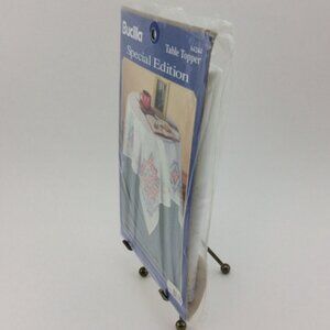 Vintage Bucilla table topper stamped on poly/cotton blend fabric with easy to follow stitch, finishing and hemming instructions.