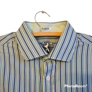 Vintage Bugatchi Short Sleeve Button Up Stripped Shirt, Bowling Shirt, Size Medium US Men, Women's Oversized Shirt
