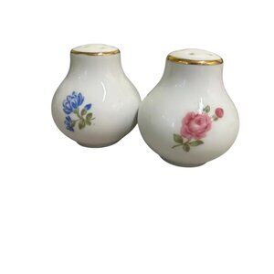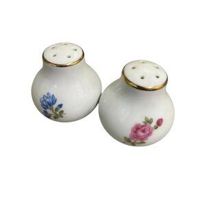 Vintage 1970s salt and pepper shakers. Gold trim detailing. One side has a purple flora. Other side has a pink or blue floral. Both shakers have 4 holes. Plastic stoppers. Unmarked.
