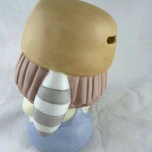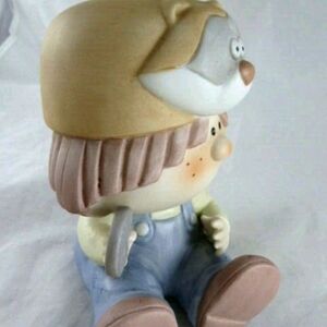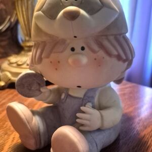 Adorable ceramic boy figurine wearing a racoon hat. Features soft pastel colors.