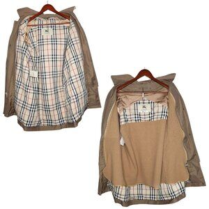 Elevate your outerwear collection with this classic and practical Burberry rain jacket. Perfect for transitional weather, this coat combines Burberry's iconic style with functional design. The timeless brown tone and is accented with the signature Nova Check pattern on the lining, collar, and/or cuffs, making it instantly recognizable. Also has the removable Wool/Camel Hair liner. Perfect for chillier days!