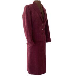 Classic skirt suit in one of this year's hot colours. Made of ultrasuede, the jacket is slim cut, lined, and has winged lapel, roll cuff long sleeves and square button front closure. Skirt has a front side slit, waistband with back zipper and button closure.