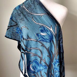 Vintage Burnout Fringe Scarf Black & Blue Floral Vines Whimsigoth Boho Evening
