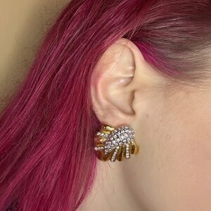 Pristine condition bold goldtone and rhinestone flower on refined beaded black strands. Matching clip on earrings. This vintage set looks new again styled with a white collared shirt and a black leather jacket!