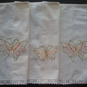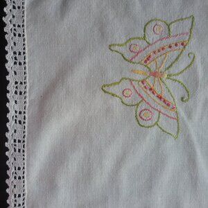 This is a lovingly hand made dresser scarf or table runner with embroidered butterflies and crocheted border on one long edge. It measures 27 inches x 11.5 inches and is made of natural cotton fabric.