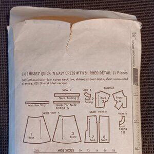 A vintage cut Butterick sewing pattern 2315 from the early 1960s. Two styles of a dress, size 14. Bust 34, Waist 26. Hip 36. Quick 'N Easy with shirred detail. All pieces are there and have been cut, instructions are included. Please see all photos. Unfortunately I ripped the envelope trying to get the pattern pieces back inside and the envelope did already have two small stains.