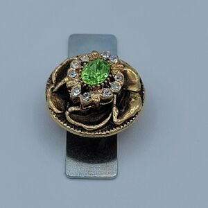 Vintage Button Brooch Goldtone Green Crystal Magnet #665