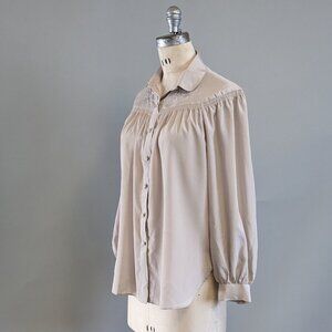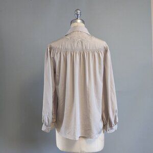 Vintage blouse with Peter Pan style collar, embroidery details on the yoke, long sleeves, fabric covered buttons. Size medium or large depending on how you like the fit.