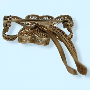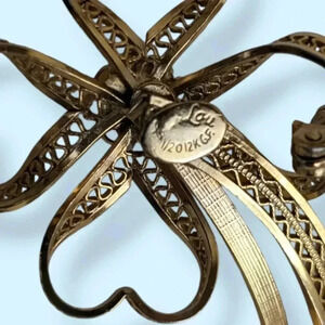 This vintage brooch by C Lou is made of 12k gold filled metal in the shape of a 4-leaf clover (in which all leaves are hearts). There is some beautiful filigree detailing throughout, and the piece is topped by a pearl in center. The brooch has a modern locking c pin closure, and the center of the back is stamped "C LOU, 1/20 12K GF". There are signs of gentle wear and time, but the piece is in good condition overall.