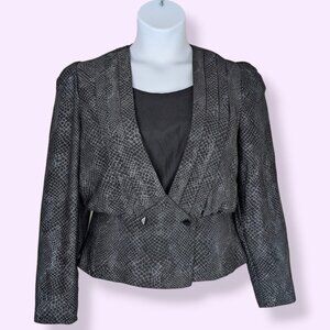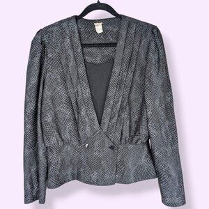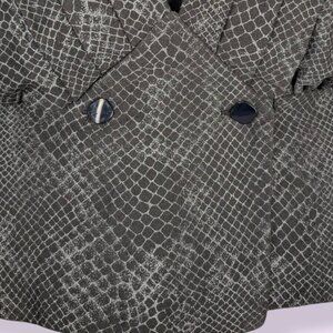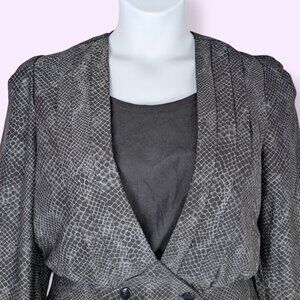 This vintage top by C&A is made of 100% polyester with a black and grey snakeskin pattern and was made in England. The top has long sleeves and a very low v neckline front with a black inner layer that is rounded and much higher, providing some modesty. There are 3 pleats on either side of the front that go from the shoulder down to the belly button where they meet and overlap. There is a 2-button opening with a hook & eye on the left for extra security, and at this level the body of the shirt comes in and then flares out a little bit. There is normal wear, but no issues affecting wearability. Based on the thickness of the fabric, this would more like be a blouse than a sweater.