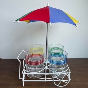 Good condition for how old it is. Includes 4 double "Old-Fashioned" Tumblers, plus a vinyl-coated cart with napkin holder and folding umbrella. There is some normal wear and tear for its age; some marks on the umbrella and cups as they have been used.